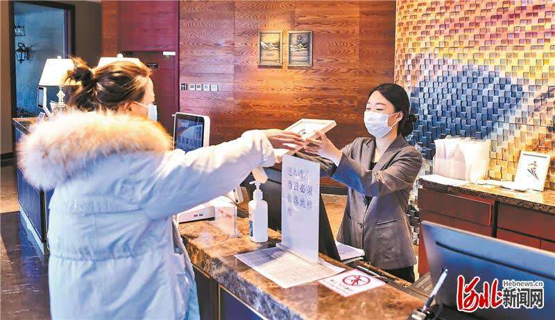 2021年12月30日,沧州市签约饭店帮扶团队的工作人员(右)在酒店前台向客人发送礼物。河北日报记者耿辉摄