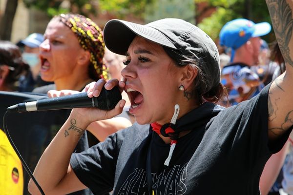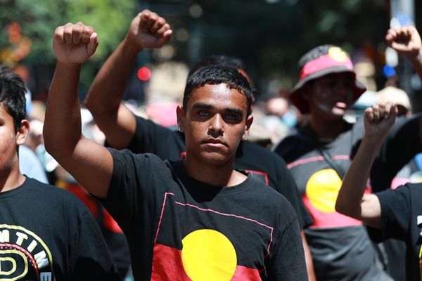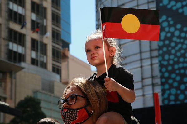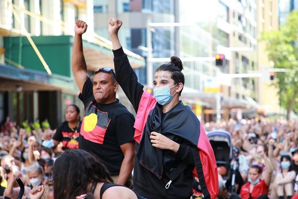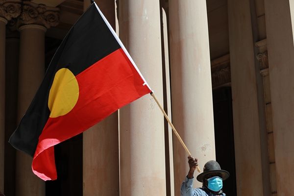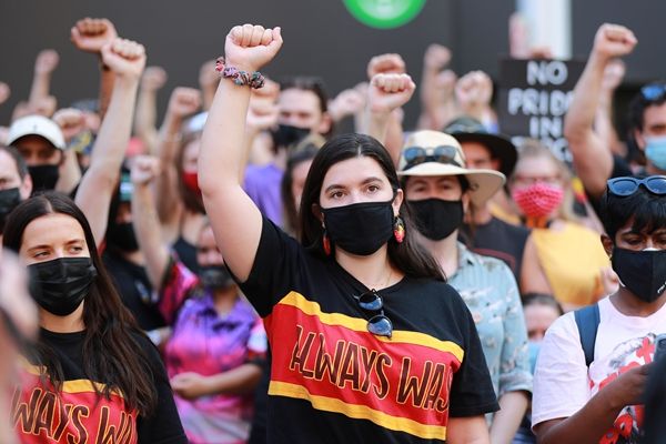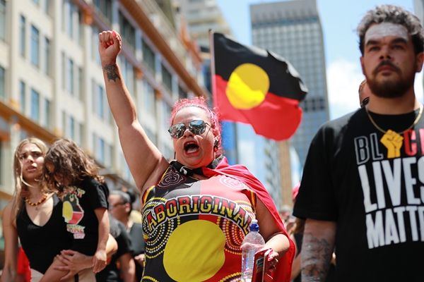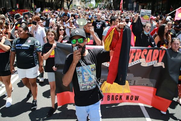 当地时间2022年1月26日,澳大利亚最大城市悉尼数千民众涌上街头,手中挥舞旗帜,高喊“这块土地过去是,未来也是属于土著居民”。示威者抗议澳大利亚土著居民遭殖民者屠杀、家园遭掠夺。