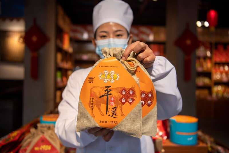 1月27日,在平遥古城南大街的一家平遥牛肉店内,工作人员展示一款牛肉产品。新华社记者 杨晨光 摄