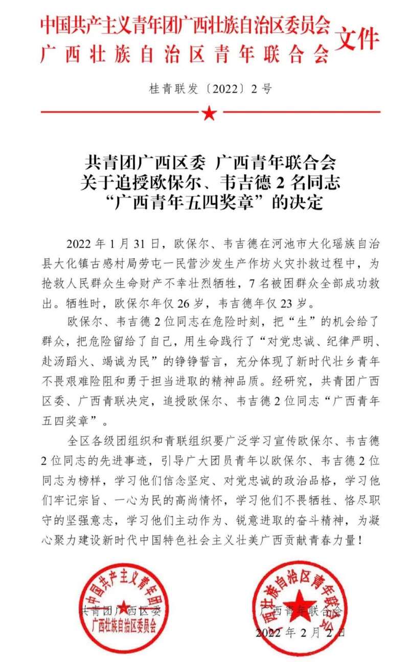 中国青年报客户端讯(中青报·中青网记者 谢洋)2月2日,团广西区委、广西青联联合发文,决定追授欧保尔、韦吉德“广西青年五四奖章”。1月31日,欧保尔、韦吉德扑救火灾时身受重伤,后经抢救无效,壮烈牺牲,欧保尔年仅26岁,韦吉德年仅23岁。