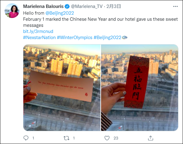 连日来,巴卢里斯在社交媒体上发布了多条推文,分享自己在北京播报冬奥会的日常,不仅有冰墩墩的照片,还有冰墩墩的徽章以及春联,她写道:“这是一次令人难忘的经历”。