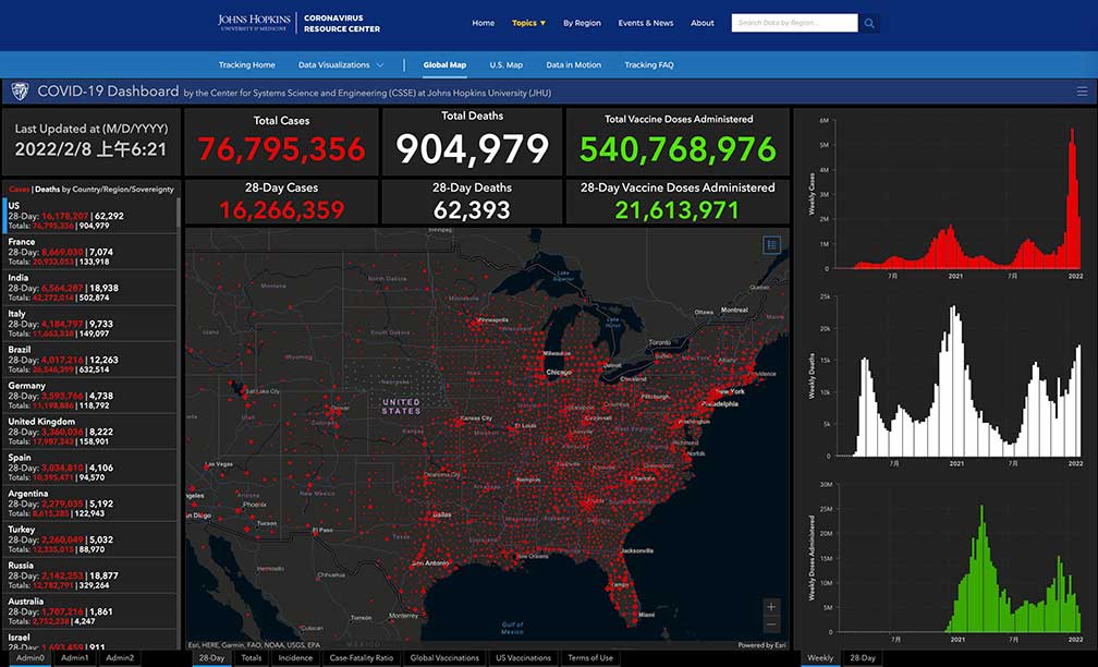 根据美国约翰斯·霍普金斯大学统计数据,截至北京时间2022年2月8日6时21分,美国新冠肺炎累计确诊病例达到76795356例,累计死亡病例达到904979例。在过去约24小时里,美国新增确诊病例302963例,新增死亡病例2456例。