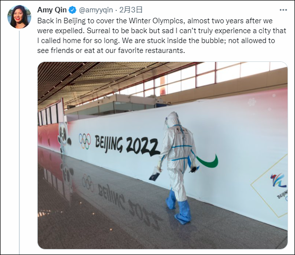 今年2月3日,北京冬奥会开幕前夕,秦颖以《纽约时报》记者的身份回到了北京。在抵达北京的第一时间,她发布推文称,离开近两年后,自己此行的目的是回来报道北京冬奥会,并抱怨奥运闭环管理让其不能像疫情前那样自由走动、看望朋友或下馆子吃饭。