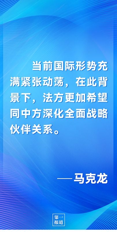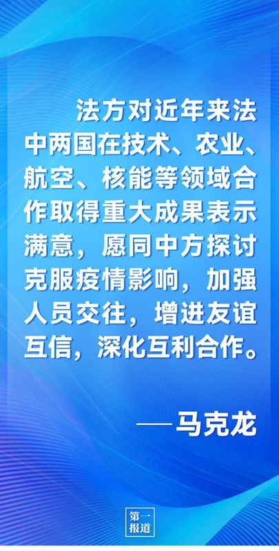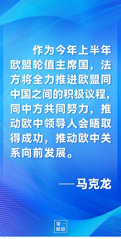 马克龙表示,当前国际形势充满紧张动荡,在此背景下,法方更加希望同中方深化全面战略伙伴关系。法方对近年来法中两国在技术、农业、航空、核能等领域合作取得重大成果表示满意,愿同中方探讨克服疫情影响,加强人员交往,增进友谊互信,深化互利合作。作为今年上半年欧盟轮值主席国,法方将全力推进欧盟同中国之间的积极议程,同中方共同努力,推动欧中领导人会晤取得成功,推动欧中关系向前发展。希望欧中投资协定批准生效取得进展。