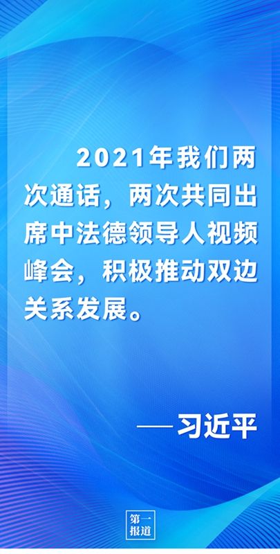 习近平强调,2021年我们两次通话,两次共同出席中法德领导人视频峰会,积极推动双边关系发展。我们的努力取得丰富成果。去年双边贸易额超过800亿美元,中方自法国进口农产品总额同比增长40%,首届人工智能研讨会和农业科技合作研讨会先后举行,首份联合实验室项目征集指南如期发布,这些都具有开创意义。新的一年,中法双方应该延续积极、健康、向上的主基调,本着相互尊重、平等相待原则,加强各层级对话交流,增进了解和互信,推动中法合作取得新成果。