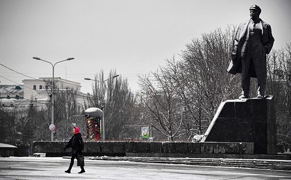 当地时间2022年1月18日,乌克兰顿涅茨克,一名妇女从列宁雕像旁走过。本文图片 人民视觉