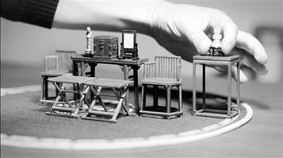 此后,李元卓便开始动手制作微缩家具,同样是出于“偶然”。“当时,我们厂主要制作红木家具和红木小件,使用的制作材料很好,甚至还有一些紫檀木。但是,我发现做完大家具之后,余下的小料被当做垃圾直接丢进烧锅炉,没有人去管理这些小料。我觉得很可惜,就慢慢把小料攒起来,开始动手制作微缩家具,这是我的一个开端。之后,我也会专门采购一些木材,比如我做过一把12厘米高的椅子,黄花梨的材料费就花了1000多块。”