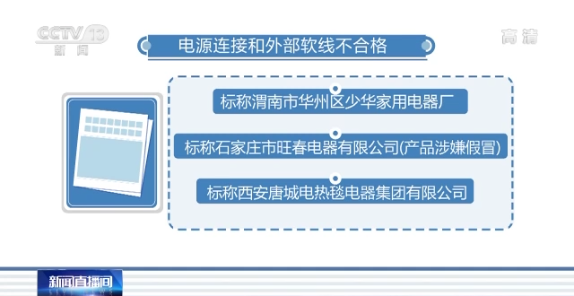 在检测过程中,标称渭南市华州区少华家用电器厂、标称石家庄市旺春电器有限公司(产品涉嫌假冒)、西安唐城电热毯电器集团有限公司三家企业的电热毯被检出电源连接和外部软线不合格。