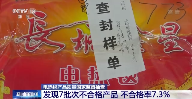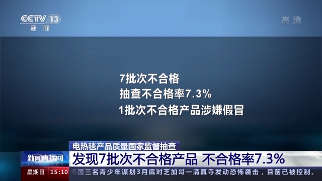 为了进一步提升电热毯的整体质量水平,日前市场监管总局组织了第九次电热毯国家监督抽查。这次抽查在流通领域开展抽样,抽查了14个省市96家企业生产的96批次电热毯产品,发现7批次不合格,抽查不合格率为7.3%。其中1批次不合格产品涉嫌假冒,已交由企业所在地市场监管部门处理。