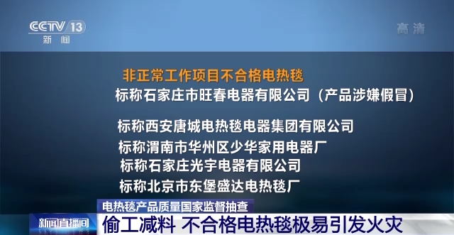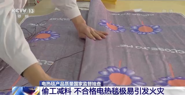 北京市质检院电子电气产品检测中心工程师 赵雪生:导致不合格的主要原因是电热毯没有温度限制措施,或温度限制装置选型与产品不匹配,极易发生火灾或者烫伤,或者触电事故。