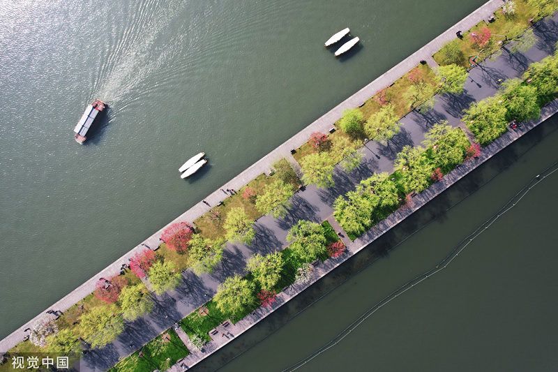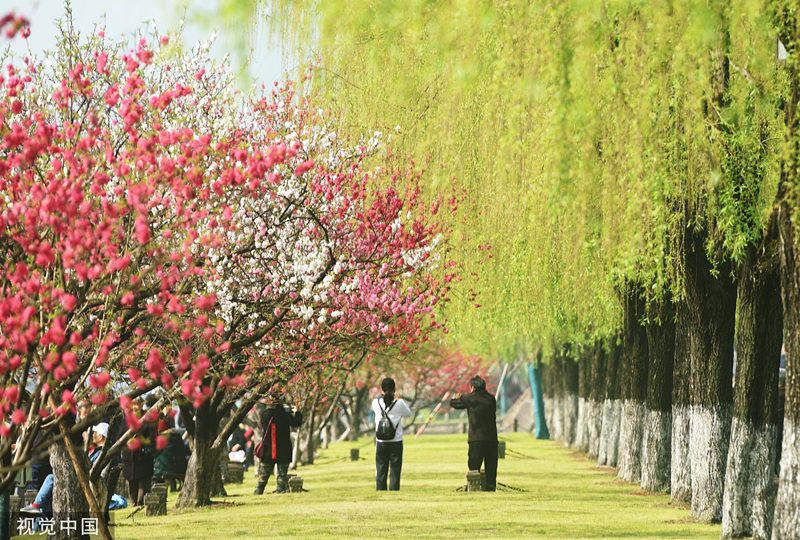 2022年3月29日,杭州西湖白堤上是桃红柳绿,吸引市民游客前来赏花踏春。