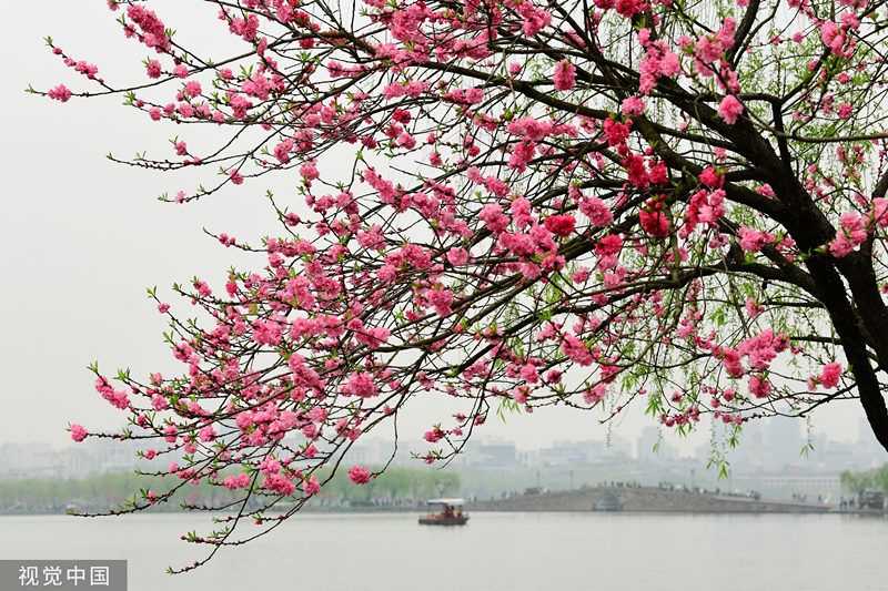 杭州:西湖桃红柳绿 吸引游人拍照留念