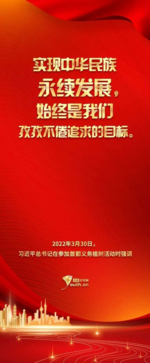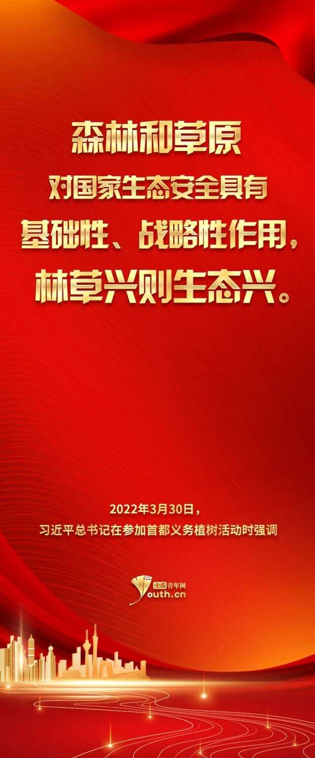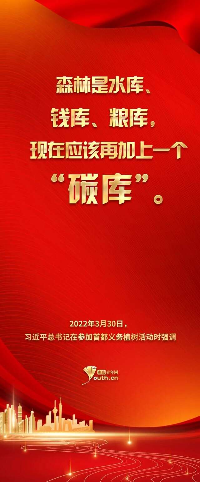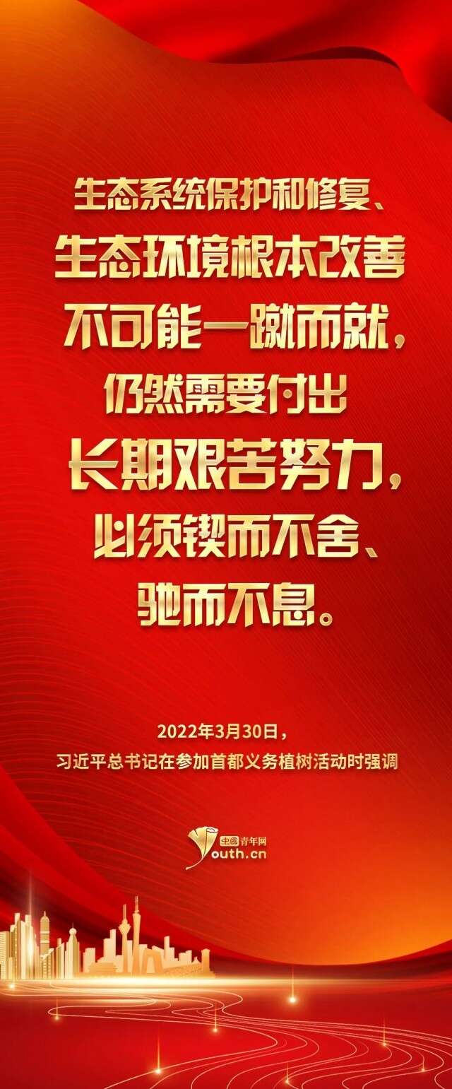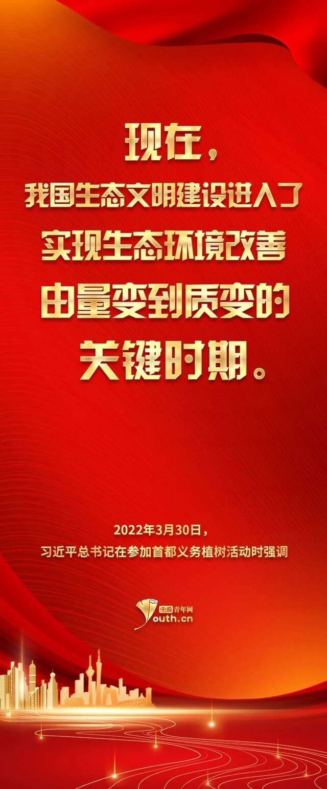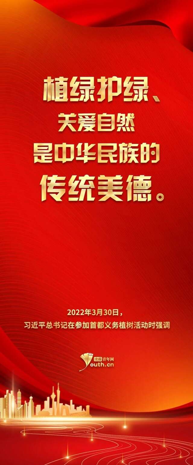 2022年3月30日,中共中央总书记、国家主席、中央军委主席习近平在参加首都义务植树活动时强调,党的十八大以来,我连续10年同大家一起参加首都义务植树,这既是想为建设美丽中国出一份力,也是要推动在全社会特别是在青少年心中播撒生态文明的种子,号召大家都做生态文明建设的实践者、推动者,持之以恒,久久为功,让我们的祖国天更蓝、山更绿、水更清、生态环境更美好。
