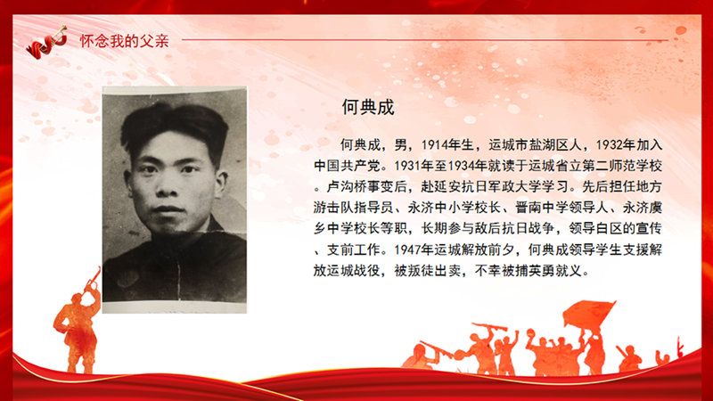 他们中,有年仅23岁的共产党员胡永康,经受一次次酷刑,在慷慨就义前愤怒地撕碎了敌人的审讯记录;有无数次穿越枪林弹雨,却牺牲在国民党反动派棍棒之下的董警吾、张雄;有年仅18岁的解放军排长赵宽虎,还有共赴国难的高源恒、芦庆珠夫妇……他们中,还有我的父亲——何典成。