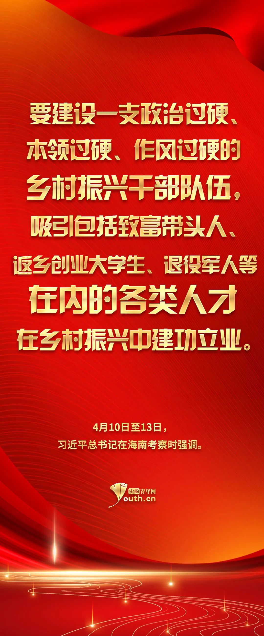 做好乡村振兴这篇大文章,青年大有可为、大有作为。习近平总书记强调,推动乡村全面振兴,关键靠人。要建设一支政治过硬、本领过硬、作风过硬的乡村振兴干部队伍,吸引包括致富带头人、返乡创业大学生、退役军人等在内的各类人才在乡村振兴中建功立业。