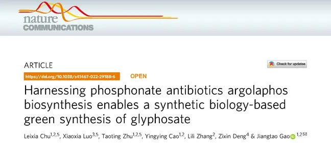 近期福建农林大学生命科学学院高江涛课题组在Nature Communications在线发表了题为“Harnessing phosphonate antibiotics argolaphos biosynthesis enables a synthetic biology-based green synthesis of glyphosate”的研究论文,利用合成生物学策略成功实现农药草甘膦的绿色合成。