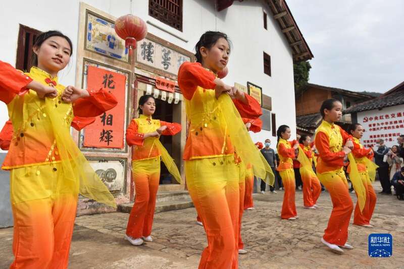 在广东梅州大埔县青溪镇,当地中小学生在红色遗址棣萼楼前演唱客家山歌(1月9日摄)。