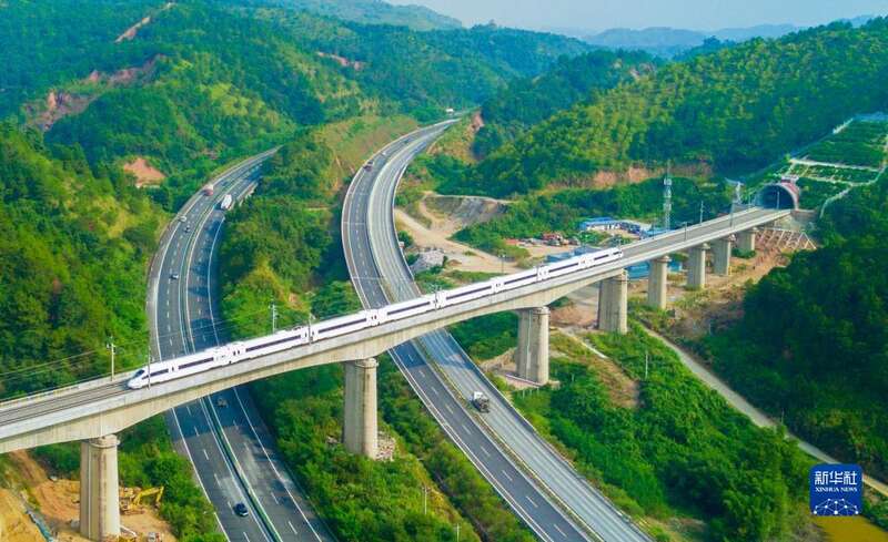 这是2019年10月11日拍摄的梅州市首条高速铁路梅汕高铁(无人机照片)。梅汕高铁跨越梅畲快速干线和梅汕高速公路。