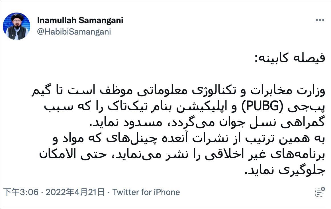 综合彭博社、俄罗斯卫星通讯社4月21日报道,阿富汗塔利班内阁21日在一份声明中强调,应用程序TikTok 和在线游戏PUBG等产品“让年轻一代迷失了方向”。