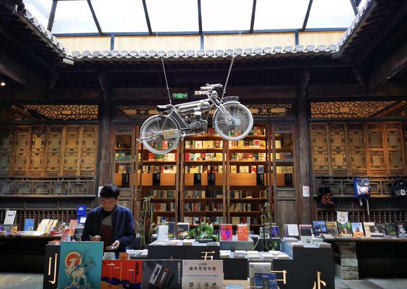 “活化”后的老宅变身成融古典与现代于一身的文艺书店,占地1200平方米,藏书总量超13000册,还与黄山市图书馆打通一体化服务,实行通借通还,引进数字化阅读设备,拓宽了当地城市阅读空间的服务业态。