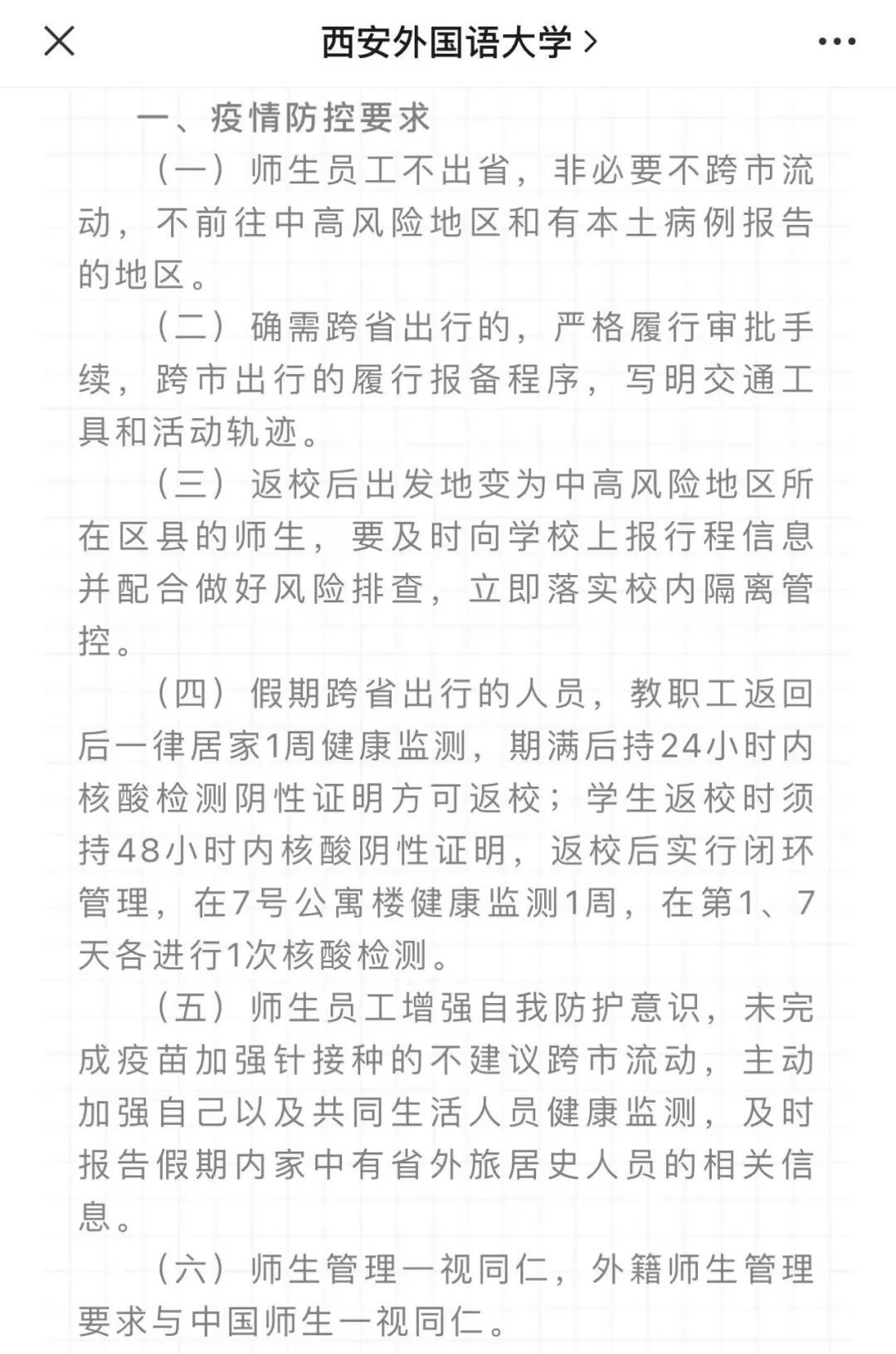此外,西安外国语大学也明确确需跨省市出行的人员防疫要求↓