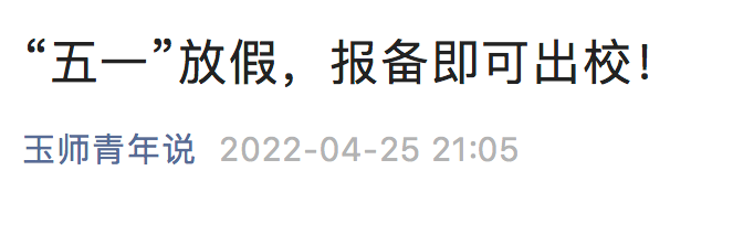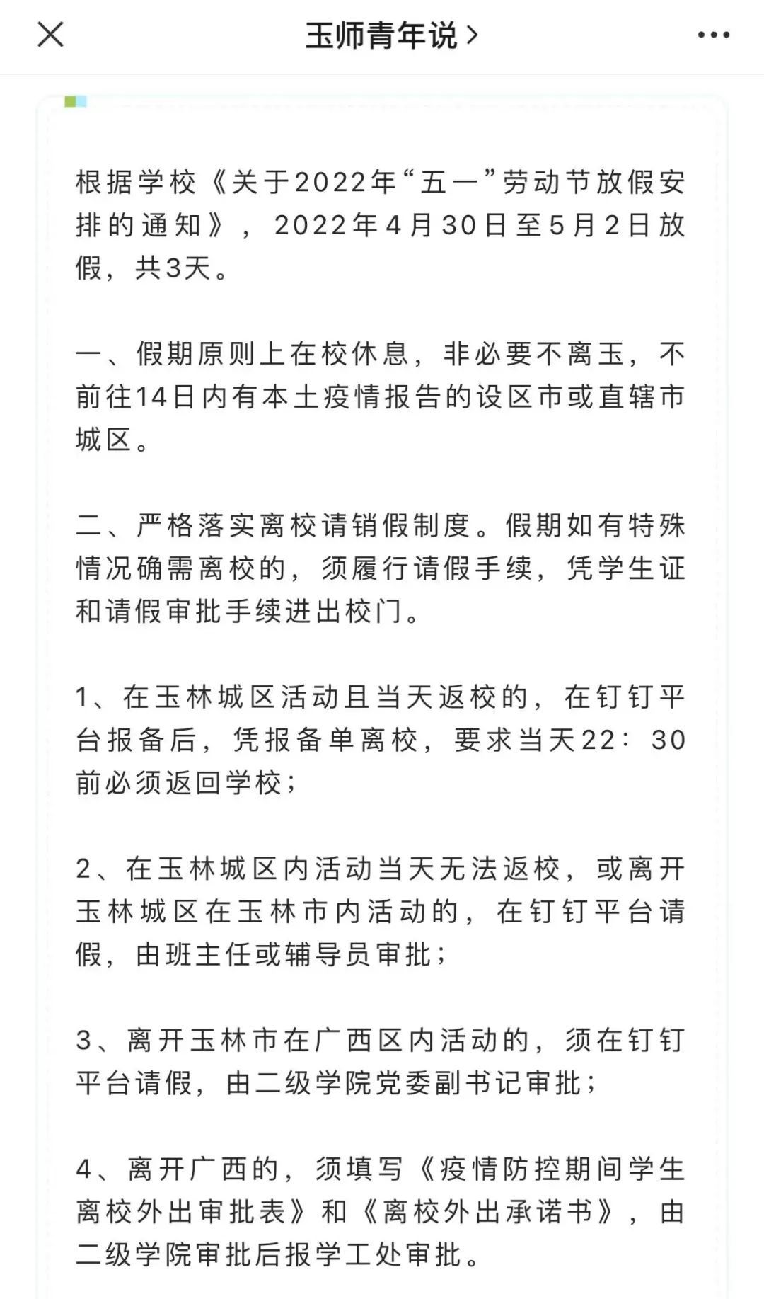 25日,玉林师范学院发文称:“五一”放假,报备即可出校。
