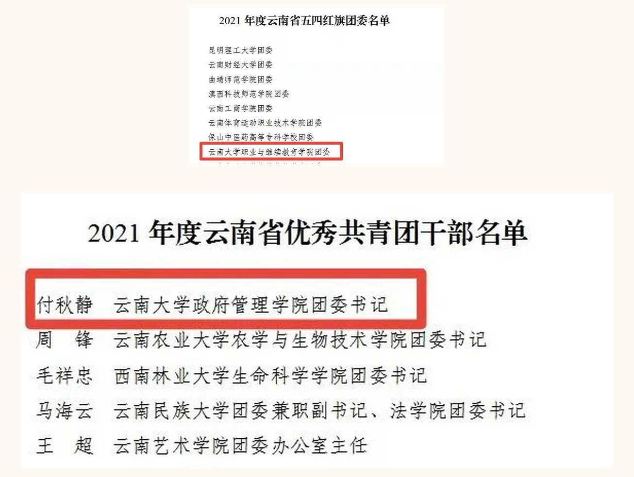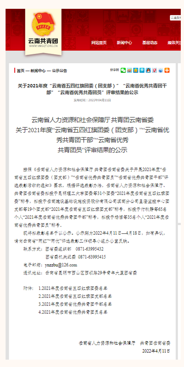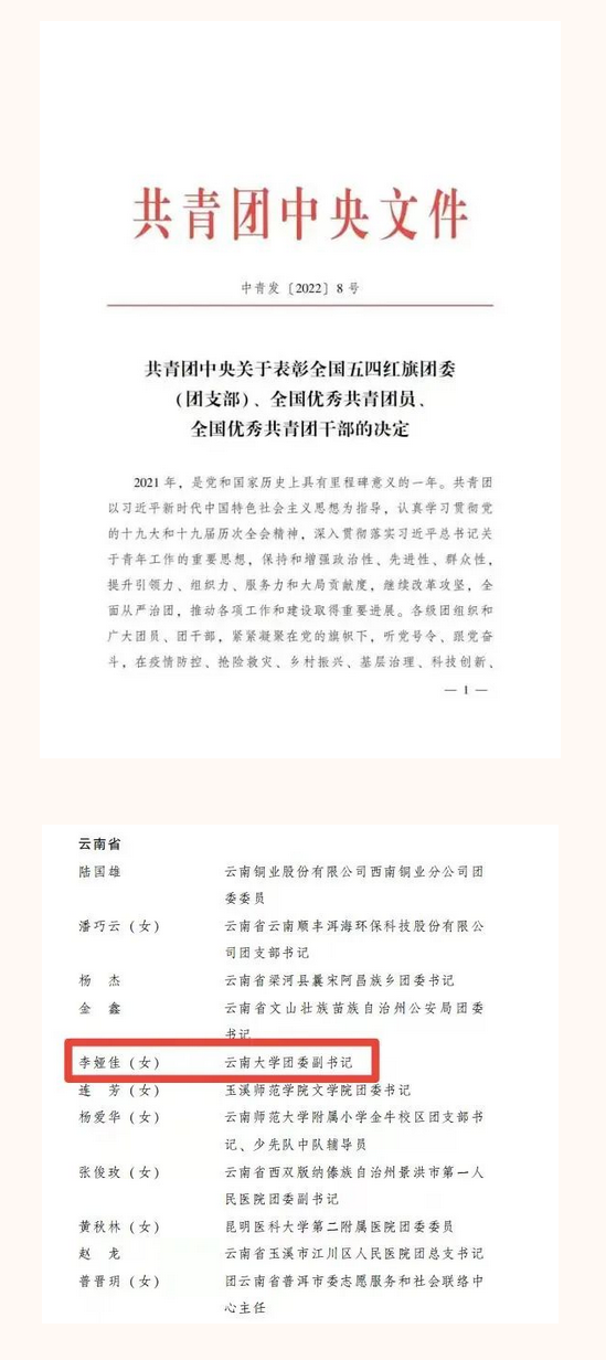 2022年是中国共青团成立100周年。近日,共青团中央、共青团云南省委分别对一批先进集体和个人进行表彰。云南大学团委副书记李娅佳老师荣获“全国优秀共青团干部”称号,职业与继续教育学院团委荣获“云南省五四红旗团委”称号,政府管理学院团委书记付秋静老师荣获“云南省优秀共青团干部”称号。
