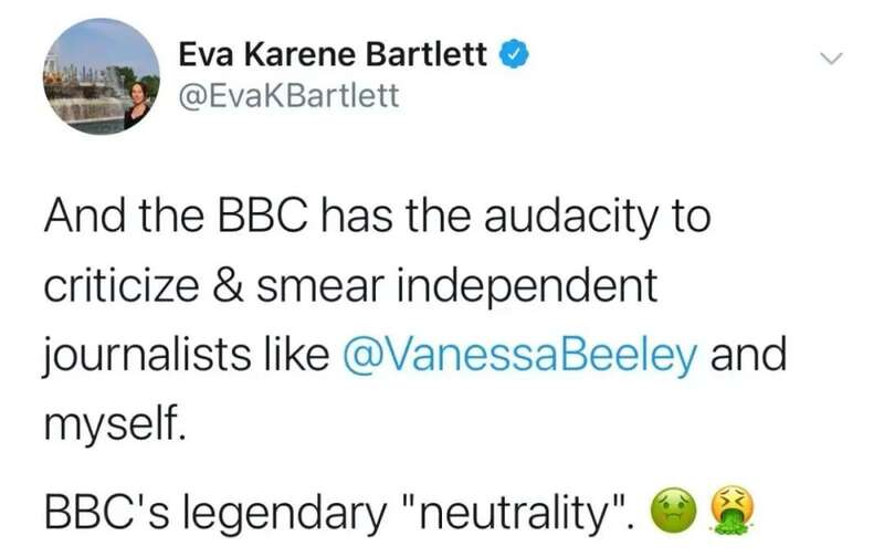 ·“BBC还敢批评、抹黑像VanessaBeeley和我这样的独立记者。BBC传说中的‘中立’。”