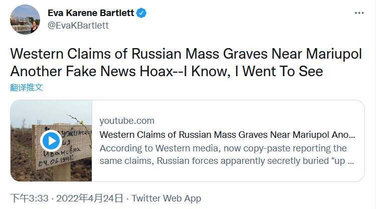·发布调查视频后,巴特利特发推文说:“西方称俄罗斯制造‘万人坑’,这是一个假新闻,我之所以知道是因为我去看了。”