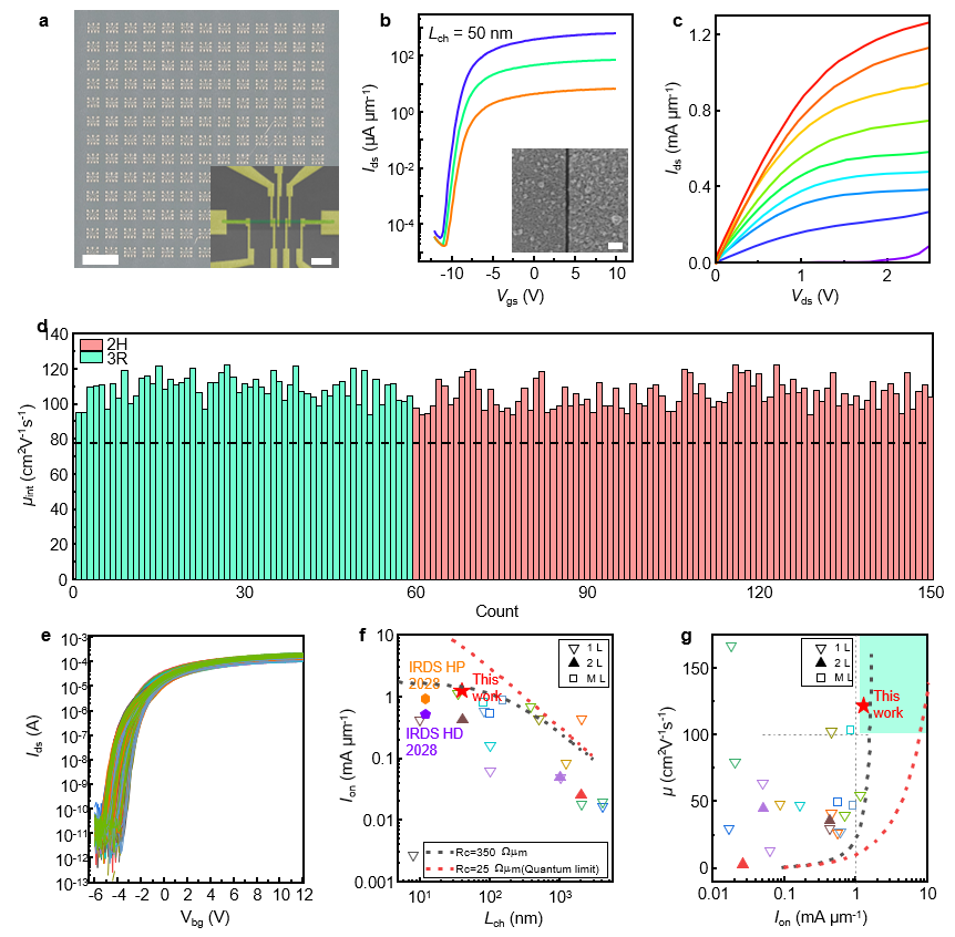 研究团队进一步制造了双层MoS2沟道的场效应晶体管(FET)器件阵列,并系统评估了其电学性能(图4)。相比单层材料,双层MoS2晶体管的迁移率提升了37.9%,达到~122.6cm2V-1S-1,同时器件均一性得到了大幅度提升。进一步,团队报道了开态电流高达1.27 mA/μm的FET,刷新了二维半导体器件的最高纪录,并超过了国际器件与系统路线图所规划的2028年目标。