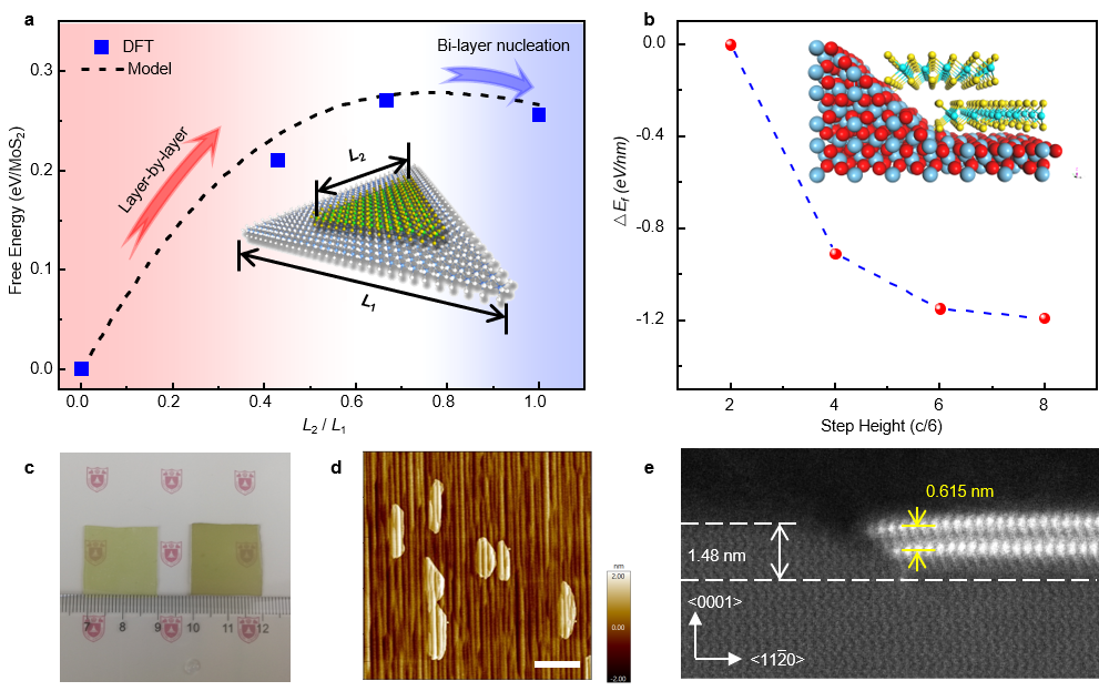 针对该问题,王欣然教授与东南大学合作,另辟蹊径,提出了衬底诱导的双层成核以及“齐头并进”的全新生长机制,在国际上首次报道了大面积均匀的双层MoS2薄膜外延生长。研究团队首先进行了理论计算,发现虽然单层生长在热力学上是最稳定的,但是通过在蓝宝石表面构建更高的“原子梯田”,可以实现边缘对齐的双层成核,从而打破了“1+1=2”的逐层生长传统模式局限(图3)。研究团队利用高温退火工艺,在蓝宝石表面上获得了均匀分布的高原子台阶,成功获得了超过99%的双层形核,并实现了厘米级的双层连续薄膜。原子力显微镜、透射电子显微镜、拉曼光谱和荧光光谱等多种表征手段均证明了双层薄膜的均匀性。进一步,团队证明了双层MoS2与蓝宝石衬底具有特定的外延关系,以及双层MoS2的层间具有2H和3R两种堆垛模式,并在理论上给出了解释。