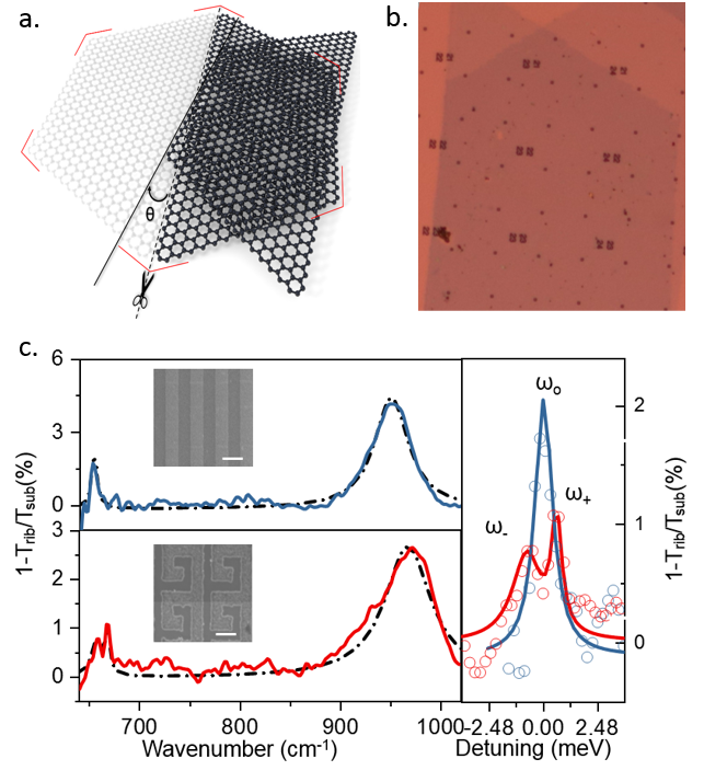 图1 扭角石墨烯示意图(a)及光学显微镜图像(b)(c)扭角石墨烯纳米条带中的红外等离激元响应。在15微米(650cm-1)长波红外范围内,手性纳米条带中出现新的具有拓扑特性的贝利等离激元新模式。