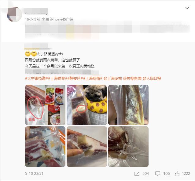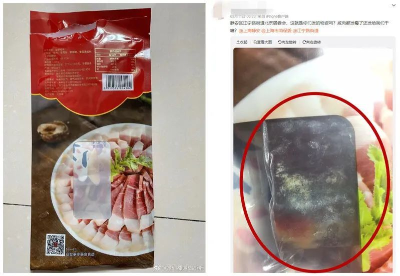 5月10日起,有部分上海居民在网络上爆料称街镇新发放的食品中有一款咸肉疑似存在变质、生虫等食品安全问题,引发网友热议。