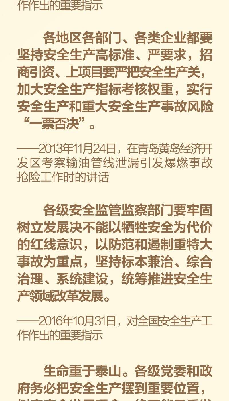 党的十八大以来,党中央对安全生产工作极其重视。习近平总书记曾深刻指出:“平安是老百姓解决温饱后的第一需求,是极重要的民生,也是最基本的发展环境。”“不要强调在目前阶段安全事故‘不可避免论’,必须整合一切条件、尽最大努力、以极大的责任感来做好安全生产工作。”