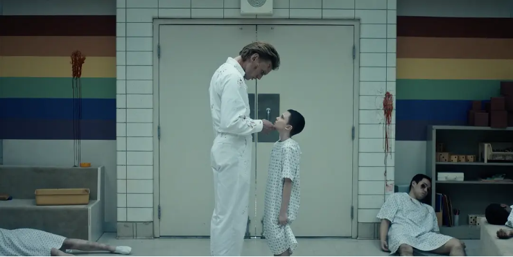 十一的恢复训练使用的是回忆法。她被放进水池,通过不断刺激回忆激发她沉睡的潜能。这条线展示了被霸凌的十一的一生——小时候在实验室被其他实验对象欺负,搬去加州后又变成高中同学的欺侮对象。编剧没有提供过一次有现实质感的解决方案。童年被欺负,是十一的超能力和善良(也是一种超能力)——救她离开。长大后十一痛打霸凌她的女生被送进少管所,又是一条捷径成为了解决之道——被秘密政府机构截胡带走。十一的这条线很无聊,因为超能力影片的看点并不是展示它的无所不能。超能力同样需要边界。规则虽然被重新制定,仍旧需要划出超能力边界的那条线的存在。否则,当所有叙事危机都可以被超能力和善良无脑化解,戏剧的张力也就不存在了。
