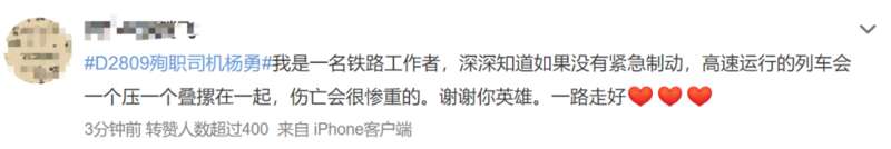 经车载数据分析,动车司机杨勇在危急时刻,发现危险,果断停车,撂下了生命中的最后一把闸,保障了车上旅客的安全。