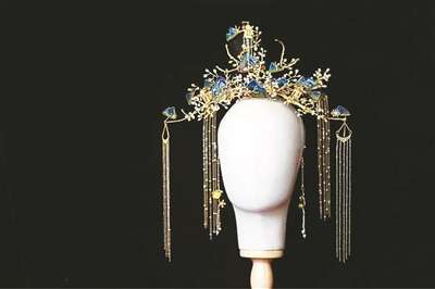 有趣的是,雁鸿的手工启蒙,就在这个时期开始。在化妆培训课上,她第一次见到老师带来的仿点翠头饰,这种从汉代流传至今的工艺让雁鸿着迷。以金属为基底,再以翠鸟的蓝色羽毛粘贴覆盖在表面,雁鸿回家上网一通搜索,了解了仿点翠制作工艺,并开始自学类似头饰的做法。