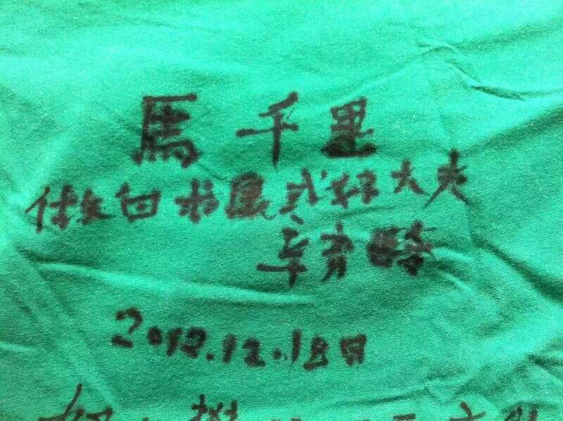 辛育龄在马千里的刷手服上题字。受访对象供图