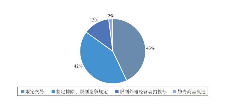 从违法行为类型来看,2021 年办结案件中,涉及限定交易行为的案件占比 43%;涉及制定排除、限制竞争规定行为的案件占比 42%;涉及限制外地经营者 招投标行为的案件占比 13%;涉及妨碍商品流通行为的案件占比 2%,通过执法 切实打破地方保护,优化市场营商环境。