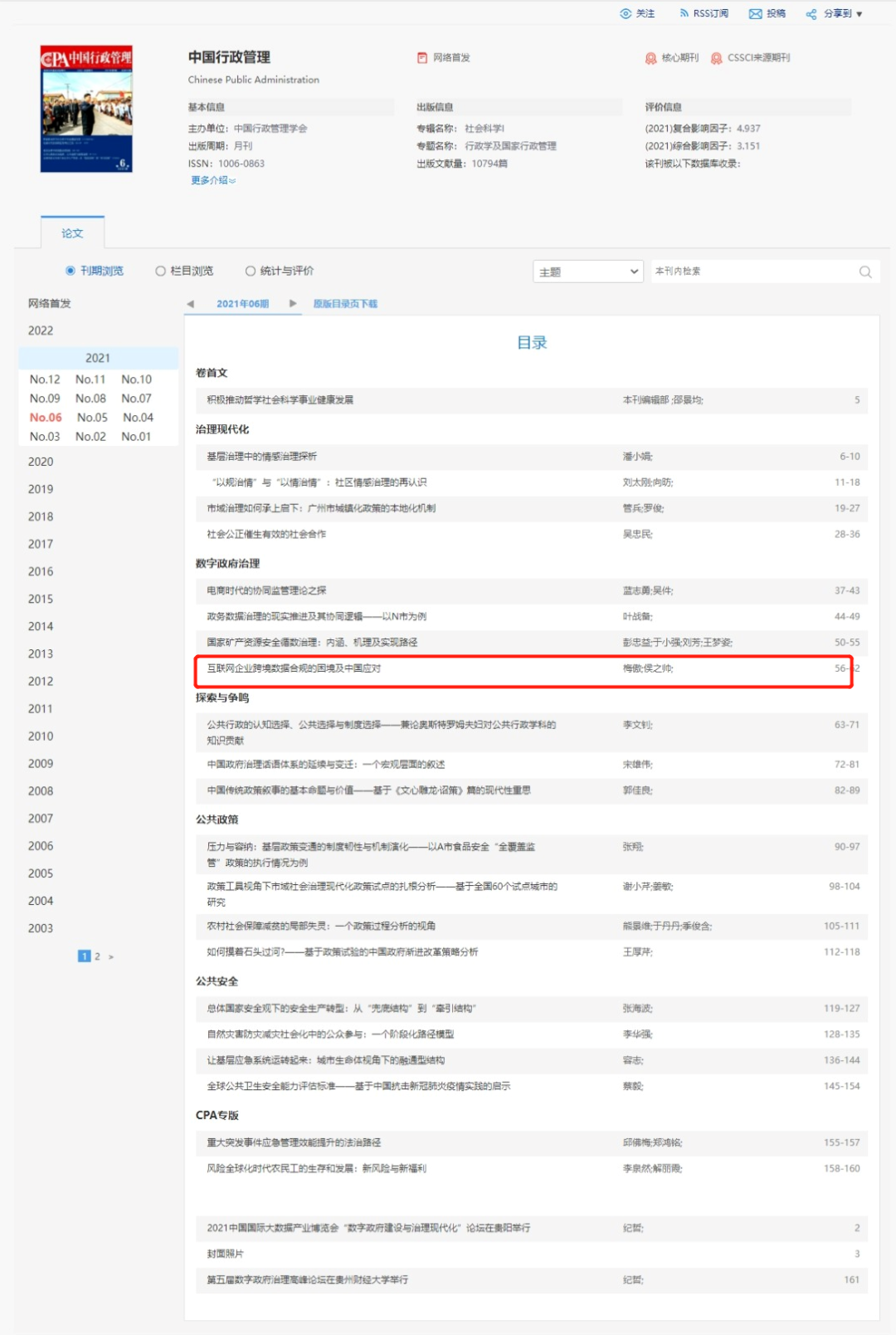 就像被不断浇灌的小树苗,侯之帅在写作中形成了自己的学术思维。他认为,法律源于生活,只要用法的思维视角去观察生活,就能够发现合适的选题。当欧盟数据法处罚谷歌一事出现后,他立马想到如果我国公司在欧盟地区发展应该如何应对。于是他以此为选题,写出论文——《互联网企业跨境数据合规的困境及中国应对》。这篇论文,在研一下学期被《中国行政管理》期刊收录。“这篇论文的发表可以说是一个奇迹,因为这是一本中文核心期刊,我一个研一的学生能够在上面发表文章,这是对我的一个巨大肯定。”回顾当时,侯之帅仍觉得那是一个巨大的惊喜。