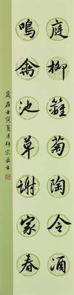 庭柳篱菊陶令酒,鸣禽池草谢家春。 释文:庭前柳树,篱边菊花,陶渊明饮酒于此,怡然自得;池塘里长满了春草,树上的鸣鸟冬去春来,谢灵运因此写出了这样的千载名句。韩宗岳(满族)
