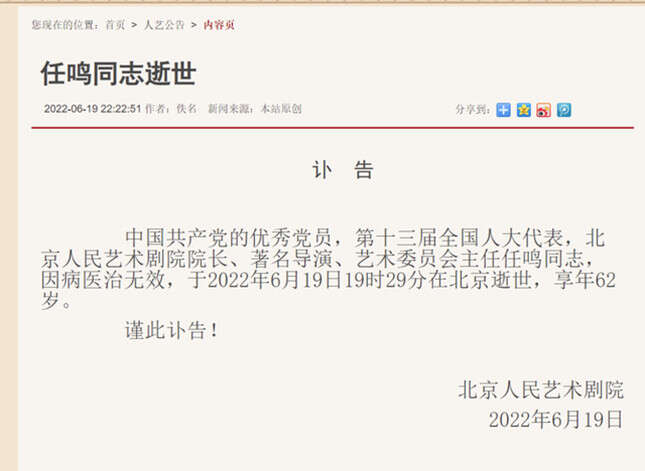 北京人民艺术剧院发布讣告:中国共产党的优秀党员,第十三届全国人大代表,北京人民艺术剧院院长、著名导演、艺术委员会主任任鸣同志,因病医治无效,于2022年6月19日19时29分在北京逝世,享年62岁。