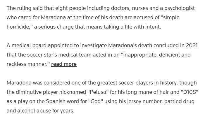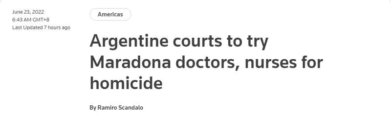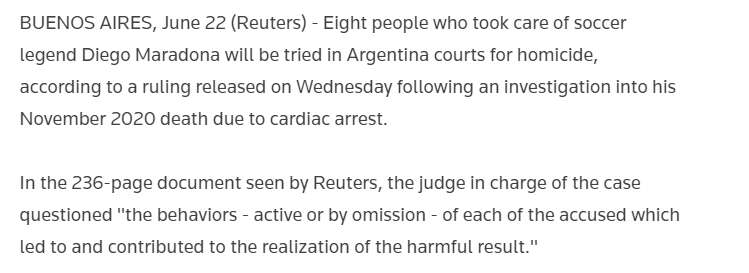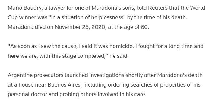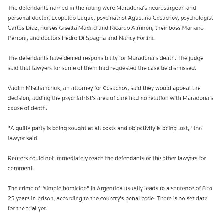 此后,阿根廷国家通讯社透露,主审马拉多纳死因的法官,以犯有“临时起意谋杀”罪,对马拉多纳医疗护理团队7名成员提出正式起诉。