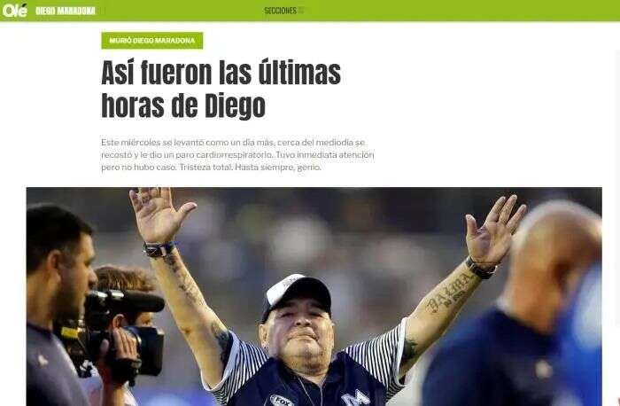 在成功接受脑血肿手术后的二十多天,马拉多纳因心脏骤停于家中去世,享年60岁。