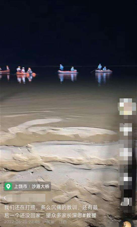 一段网络视频显示,有救援队队员驾驶多艘救援艇在江面上搜寻失踪人员,还有多名救援队员在岸上进行配合。视频发布者表示,6月25日下午,江西上饶余干县信江沙港大桥附近水域,几个孩子玩水时4人发生溺水,救援队打捞起来3个,还有1个正在打捞中。多名网友在评论区表示,溺水者都来自余干县玉亭镇毛溪村。