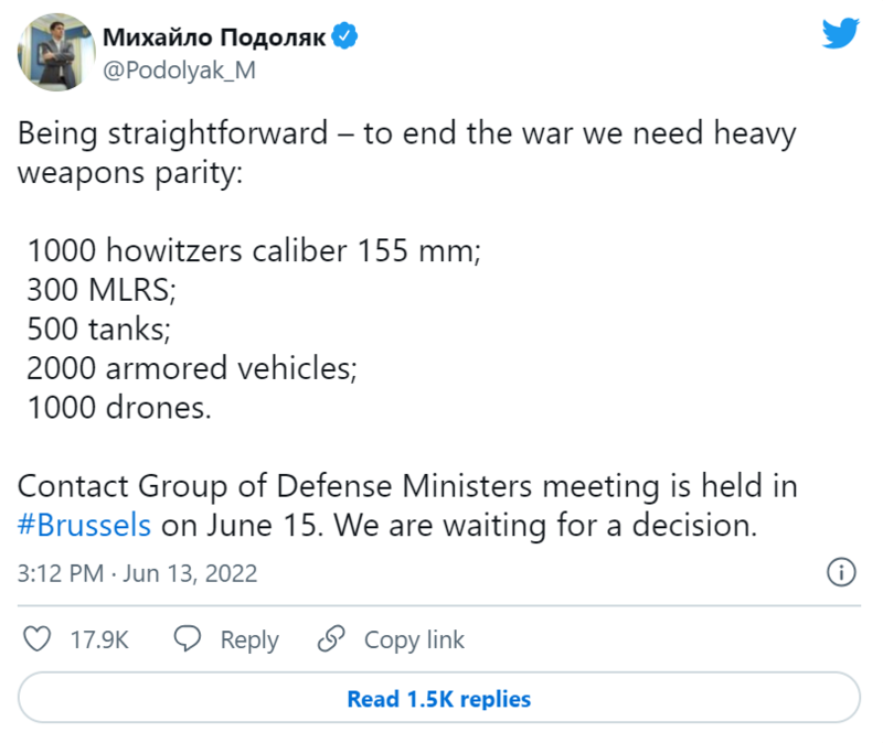 在欧盟国家领导人临行前几天,乌克兰总统办公室主任顾问波多利亚克在社交媒体上发布了一份武器装备的“愿望清单”,其中包括1000门155毫米榴弹炮、300套多管火箭武器系统、500辆坦克、2000辆装甲车以及1000架无人机。