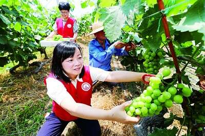 浙江省湖州市德清县雷甸镇杨墩生态休闲农庄的一处葡萄大棚内,党员志愿者帮果农采摘葡萄。王正摄/光明图片
