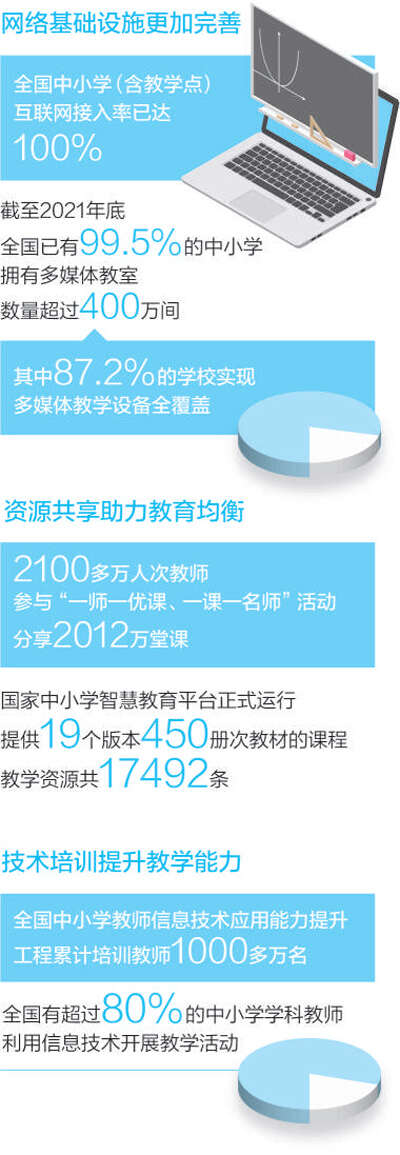 加快推进学校网络基础设施建设,改善网络教学环境,是教育信息化的基础。据了解,2020年底,全国中小学(含教学点)互联网接入率就已达到100%,未联网学校实现动态清零。截至2021年底,全国已有99.5%的中小学拥有多媒体教室,数量超过400万间,其中87.2%的学校实现多媒体教学设备全覆盖。