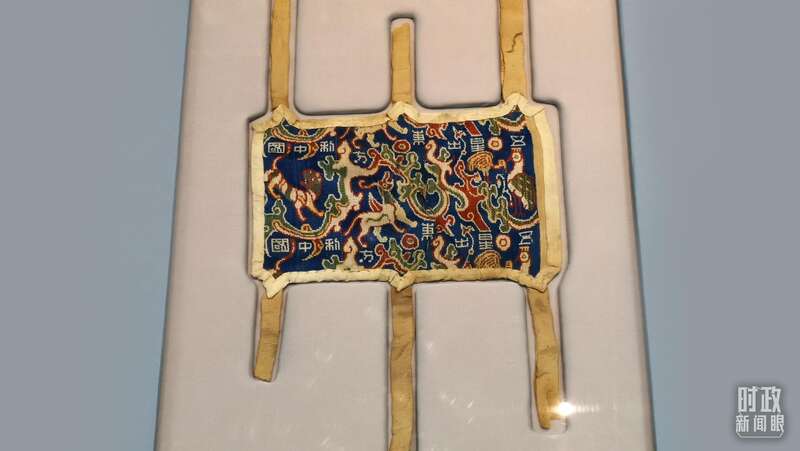 △“五星出东方利中国”锦护臂,民丰县尼雅遗址出土。(总台央视记者李晓周拍摄)