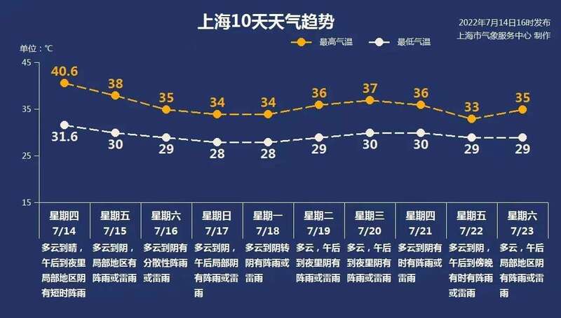 昨天(14日),上海发布了今年第三个高温红色预警,当日最高温为40.6℃。7月5日至今,上海已连续10天最高气温超35℃,有3天超过40℃。